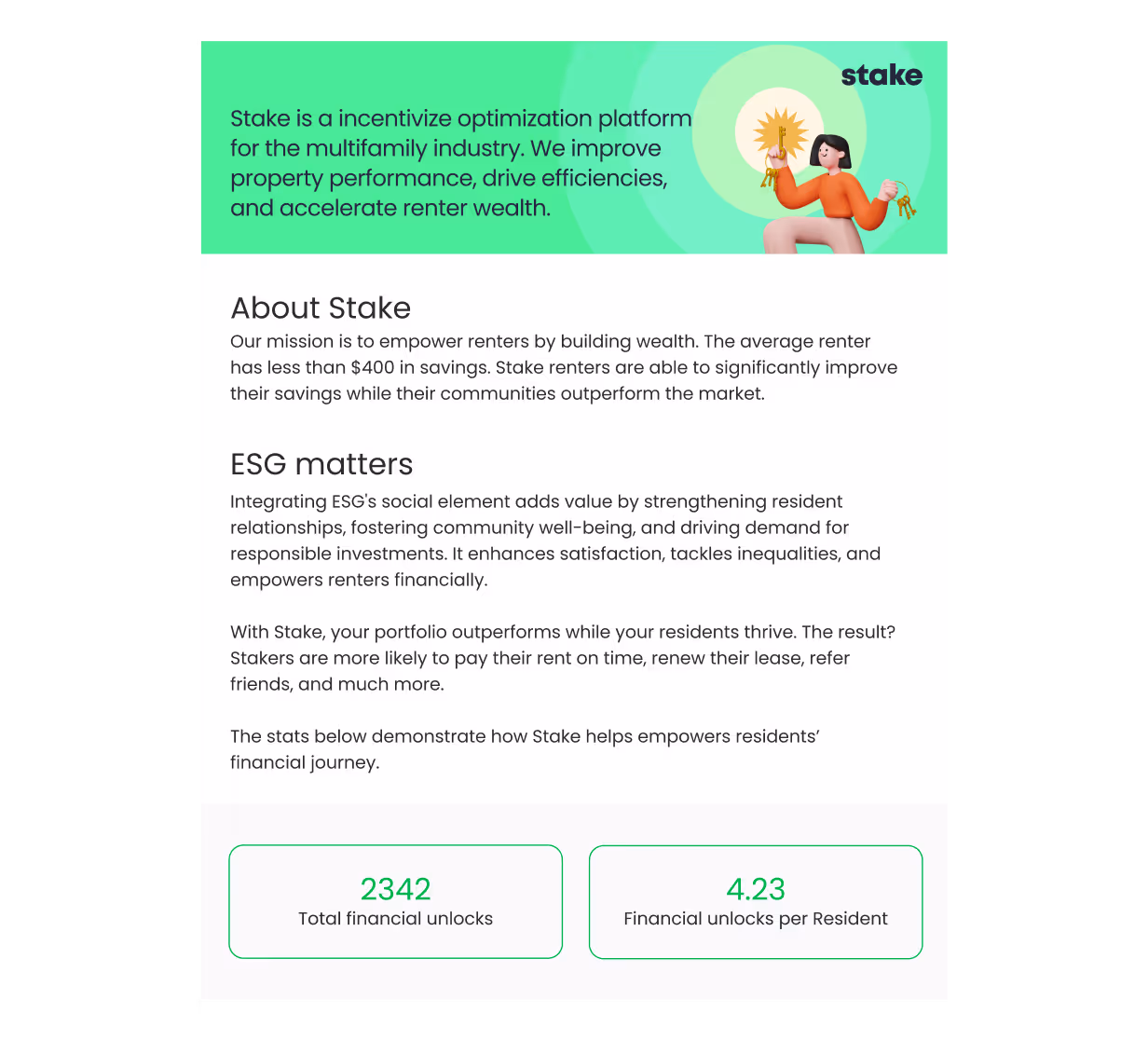 Measure and report the key social impact metrics for an ESG strategy that actually moves the needle. Stake’s ESG Dashboard has data sets for reporting in investor letters, GRESB, and other ESG disclosures.